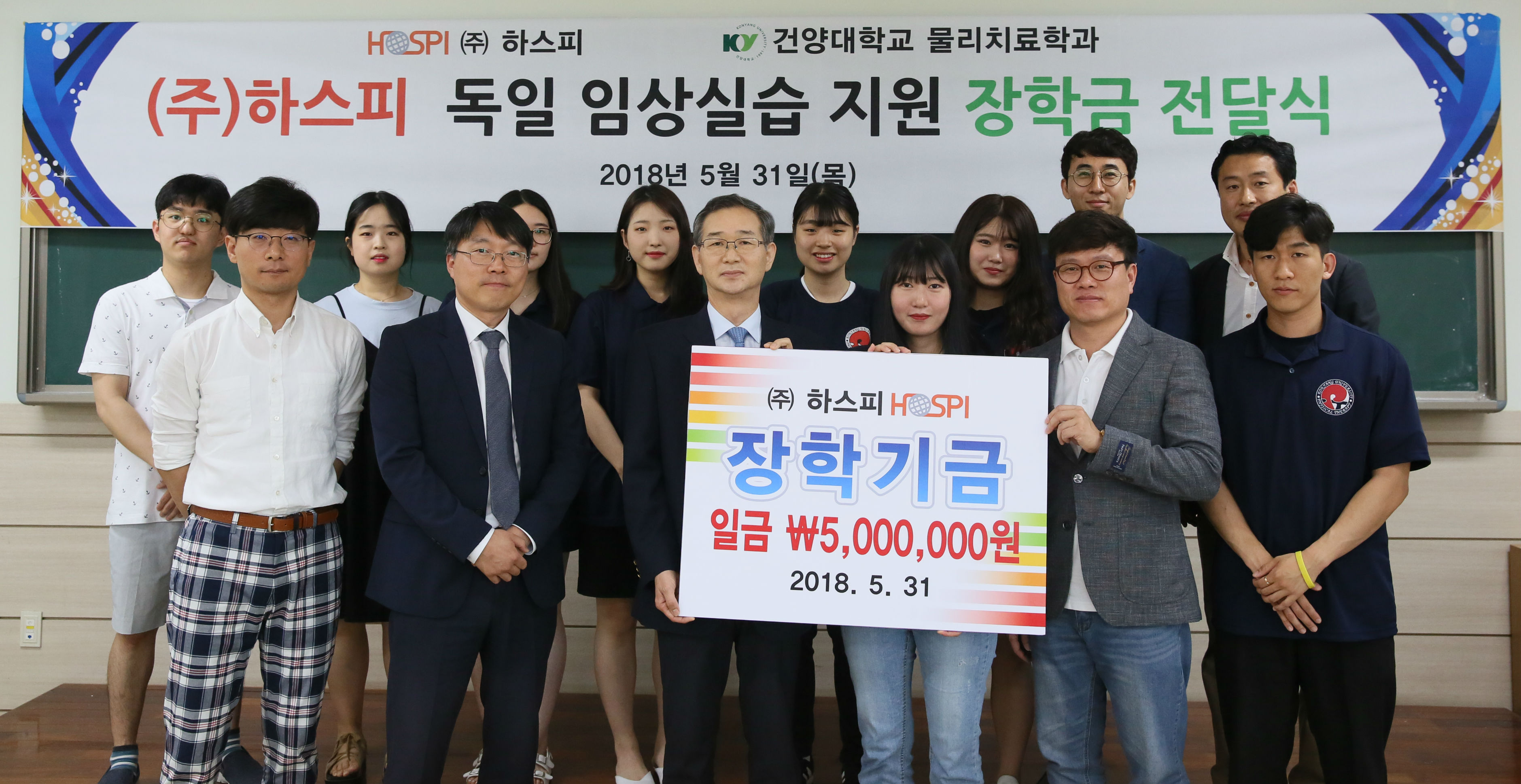 이번에 전달된 장학금은 2018년 상반기 독일로 임상실습을 떠나는 물리치료학과 4학년 재학생 10명에게 장학금으로 지급될 예정이다. 건양대 물리치료학과는 지난 2013년부터 매년 4학년 재학생 중 선발된 학생을 대상으로 독일 퀼른대학병원, 엠블란티쿰재활병원, 레버쿠젠스포츠재활센터에서 4주간 집중적인 임상 실습교육을 실시하고 있다. ㈜하스피 이준수 부사장은 “이 장학금을 통해 학생들이 해외임상실습에 조금이라도 더 배우고 경험해올 수 있다면 큰 보람이 될 것”이라고 밝히며 “건양대의 가족기업으로서 앞으로도 건양대 물리치료학과의 우수인재 육성을 위하여 지속적으로 함께 노력할 계획”이라고 말했다.