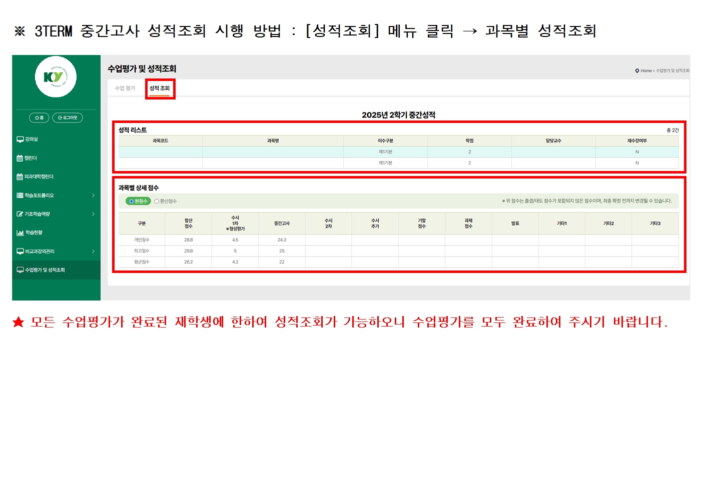 | 제목 | 2025학년도 2학기 4TERM 제1차 수업평가 및 중간고사 성적 공람 안내 | ||||