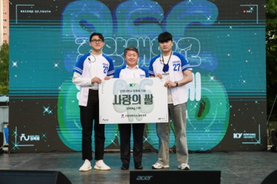 9일 저녁 건양대 대전 메디컬캠퍼스에서 열린 한솔대동제 개회식에서 건양대와 총학생회가 함께 어려운 이웃을 위해 1000KG의 쌀을 기부하는 모습.jpg