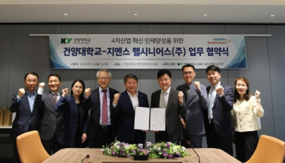 건양대학교(총장 김용하)와 지멘스 헬시니어스(SIEMENS Healthineers)가 15일 건양대 메디컬캠퍼스 죽헌정보관에서 4차산업 혁신 인재양성을 위한 업무협약 체결식을 가졌다.