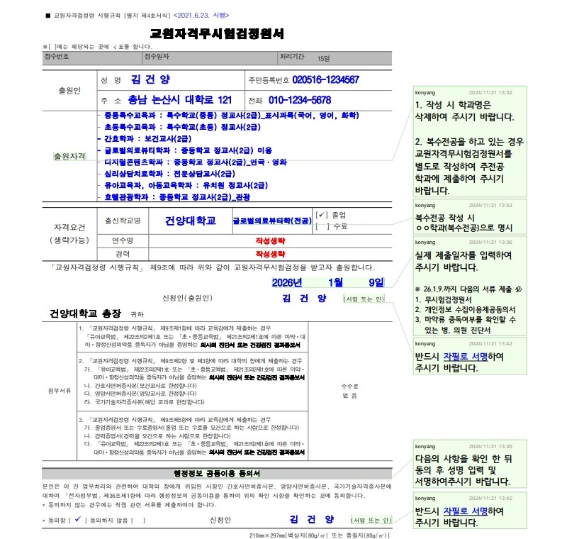 2026년 2월 졸업대상자 중 교직이수 예정자를 대상으로 무시험 검정 원서를 제출받고자 하오니 다음의 사항을 숙지하시어 기한 내 구비 서류를 갖춰 제출하여 주시기 바랍니다.