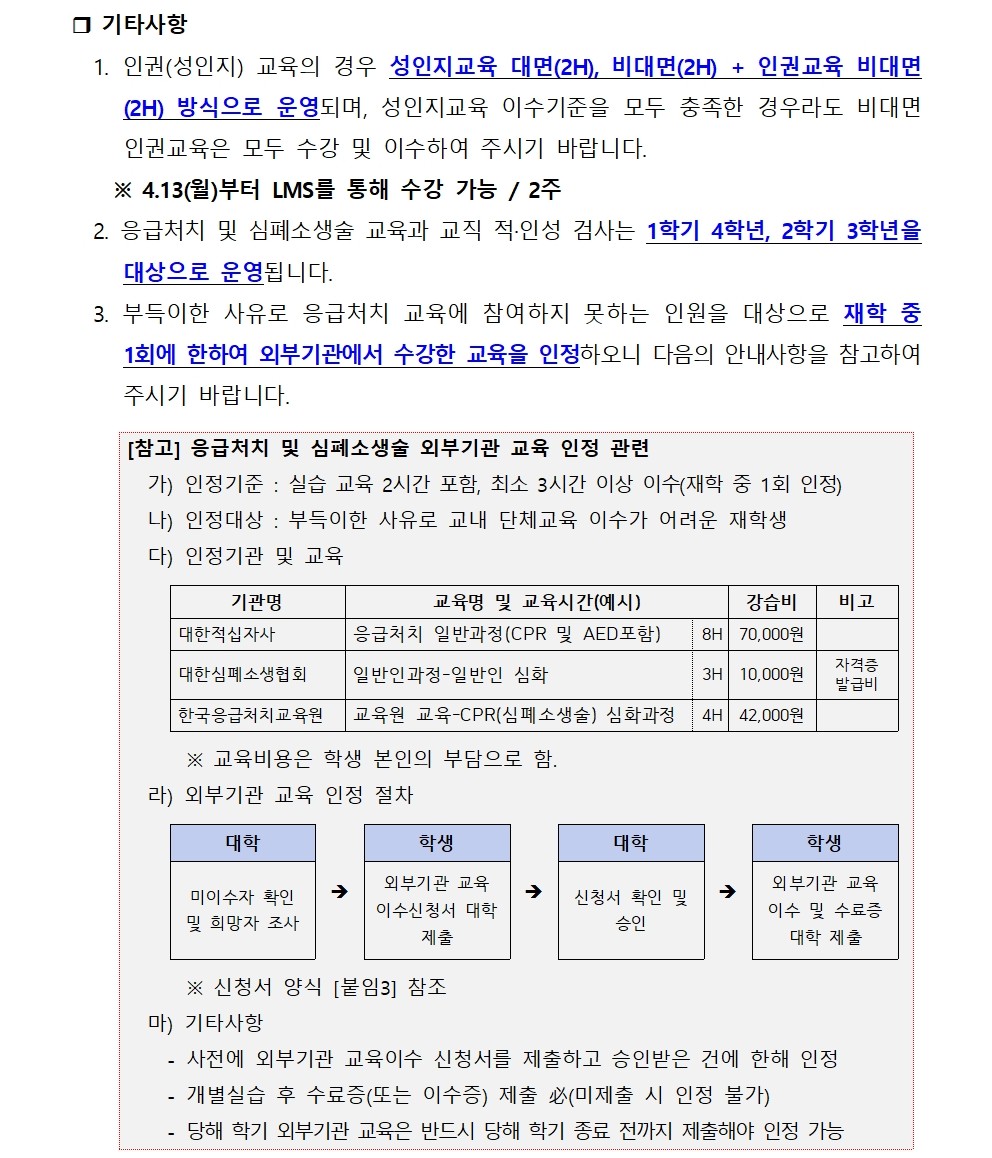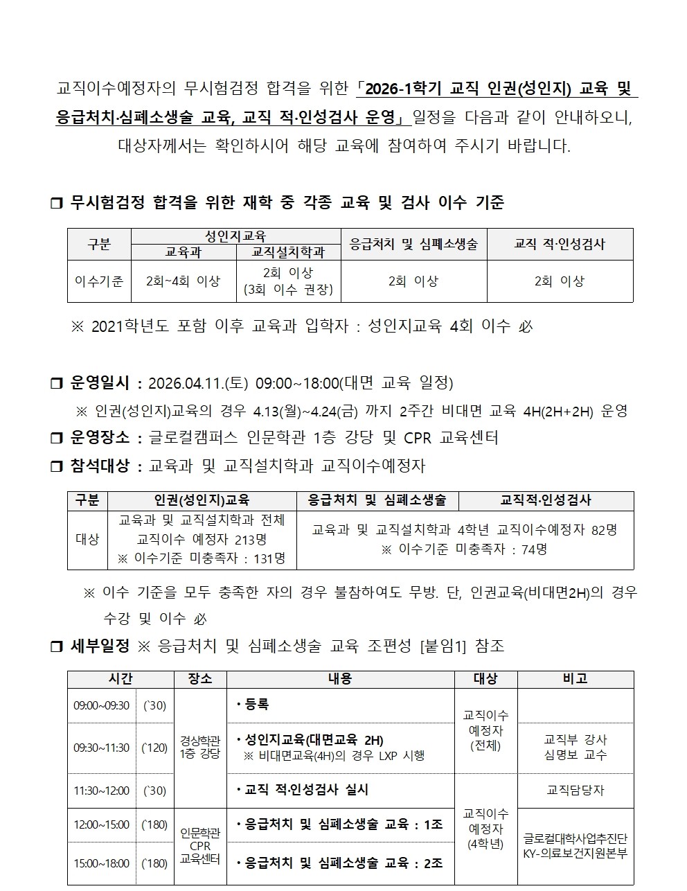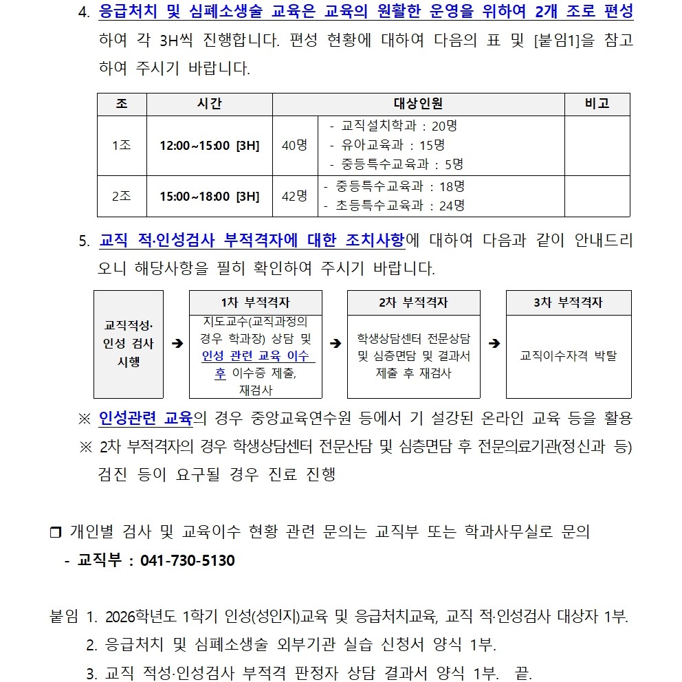| 제목 | 2026-1학기 교직 인권(성인지)교육 및 응급처치·심폐소생술 교육, 교직 적·인성검사 운영 안내 | ||||